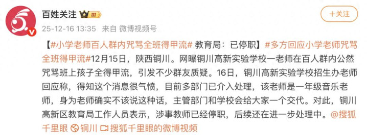 对此,铜川高新区教育局工作人员表示,涉事教师已经停职,后续还在进一步处理中。