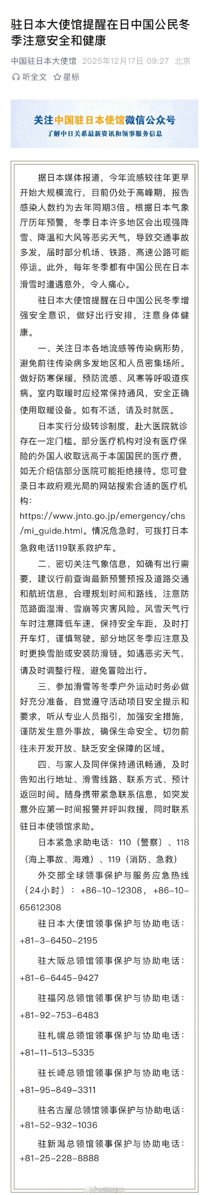 [#提醒在日中国公民冬季注意安全健康#]#日本流感目前仍处于高峰期#据日本媒体报道,今年流感较往年更早开始大规模流行,目前仍处于高峰期,报告感染人数约为去年同期3倍。根据日本气象厅历年预警,冬季日本许多地区会出现强降雪、降温和大风等恶劣天气,导致交通事故多发,钙v交流群届时部分机场、铁路、高速公路可能停运。此外,每年冬季都有中国公民在日本滑雪时遭遇意外,令人痛心。驻日本大使馆提醒在日中国公民冬季增强安全意识,做好出行安排男男,注意身体健康。(中国驻日本大使馆)